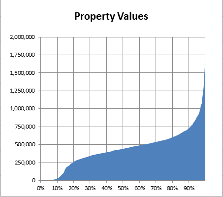 About 14% of the values fall below 100K - probably secondary buildings and smaller property parcels. Starting from there, though, you can see about half the town has property value below 500K. About 90% have valuations below 750K. At the far end, we have about a dozen properties valued over 1.5M. Several of those are businesses. This graph doesn't show government or non-profit (untaxed) properties.